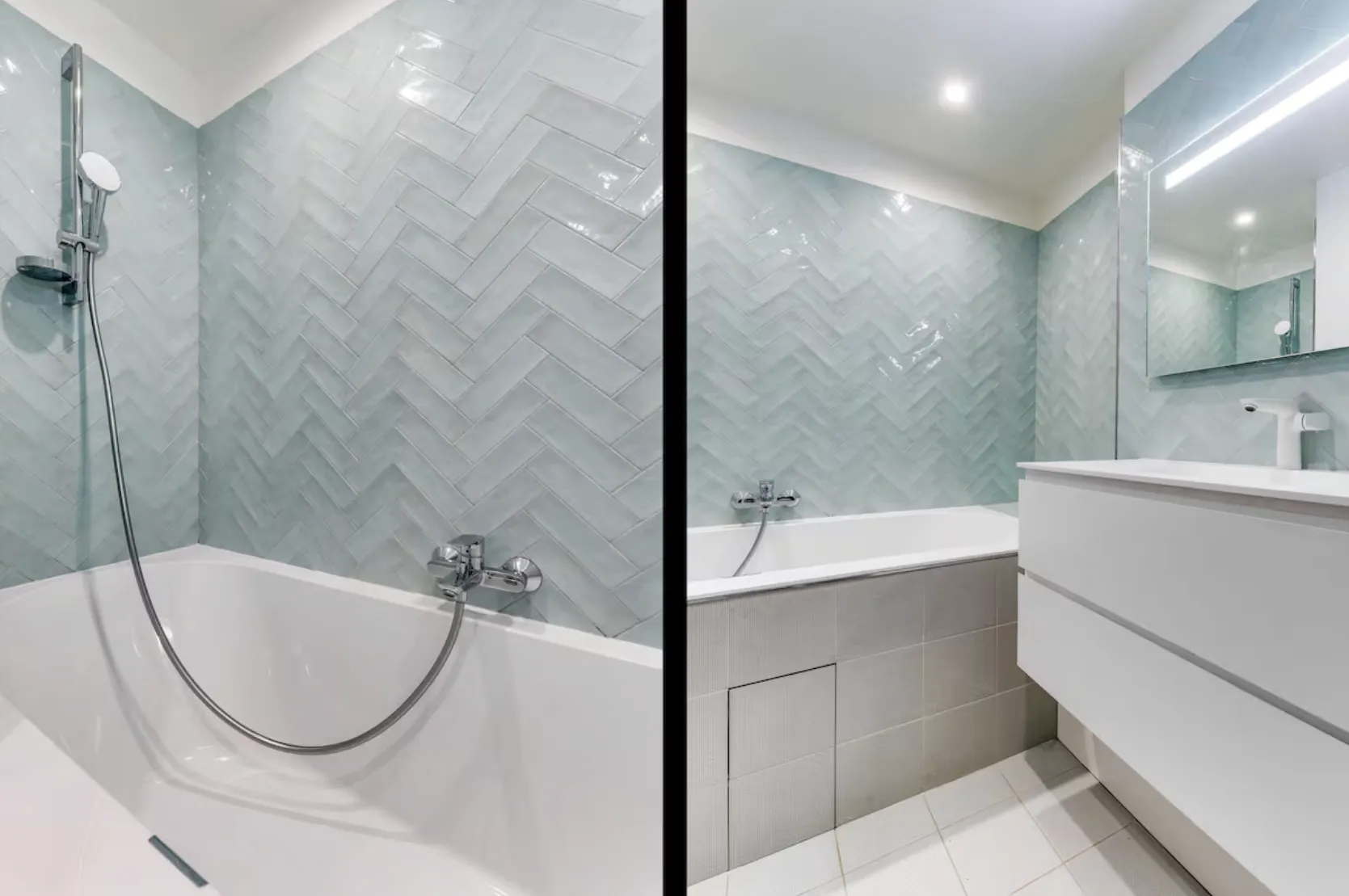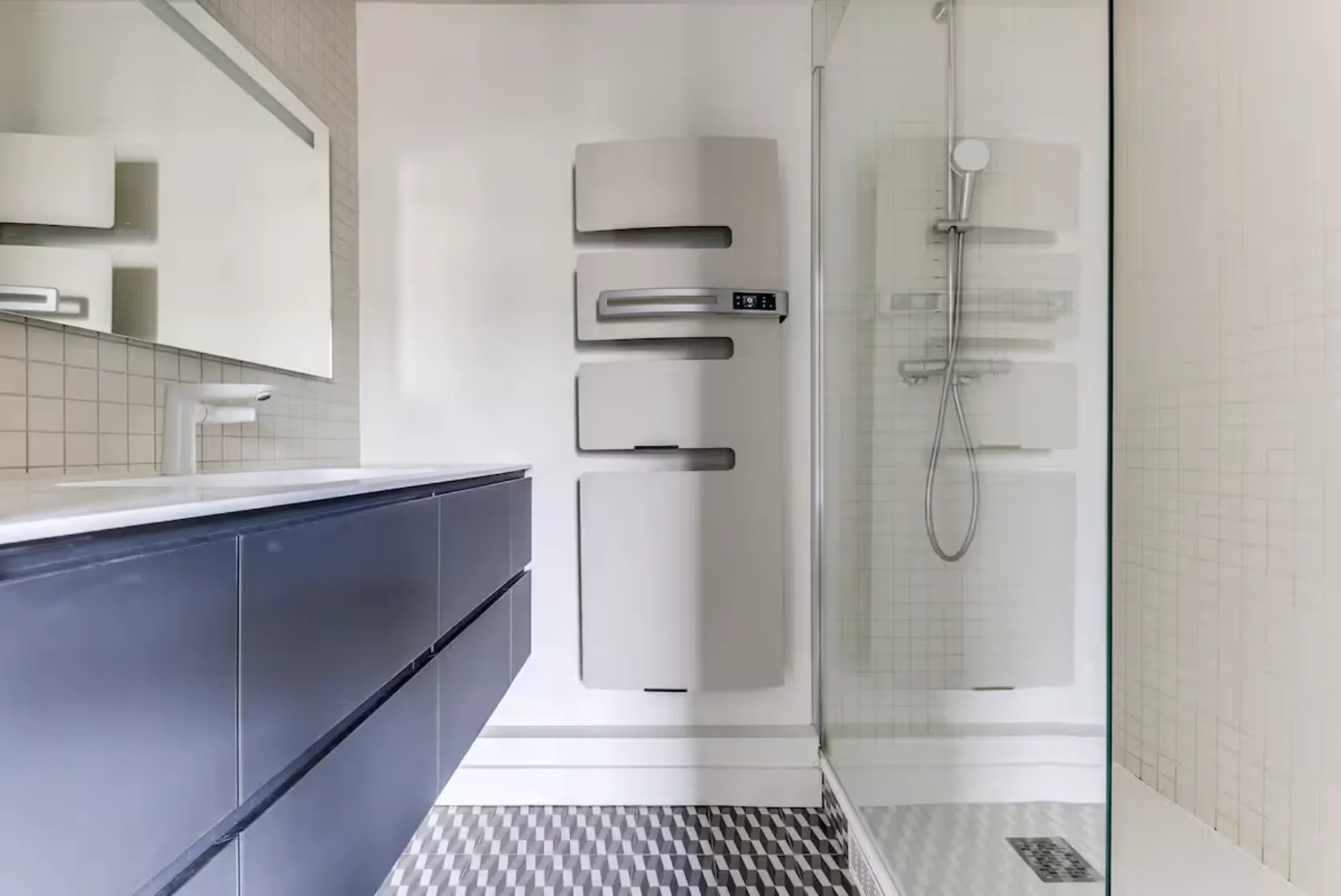 La chambre principale, avec son lit queen-size (160×200 cm), et la seconde chambre, équipée de deux lits simples (80×200 cm), sont toutes deux orientées côté cour pour garantir des nuits paisibles et silencieuses. La climatisation centralisée assure un confort optimal tout au long de l’année.