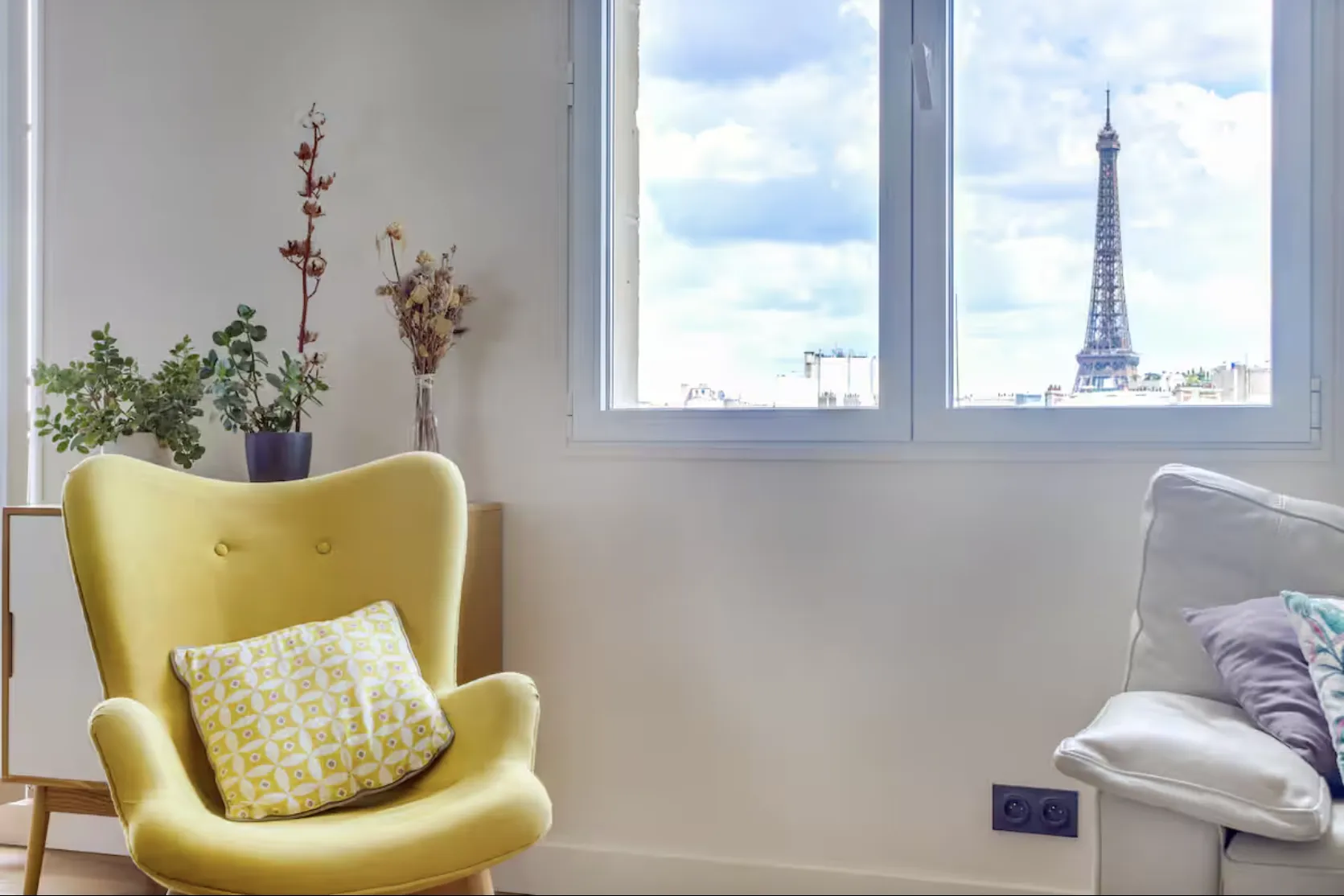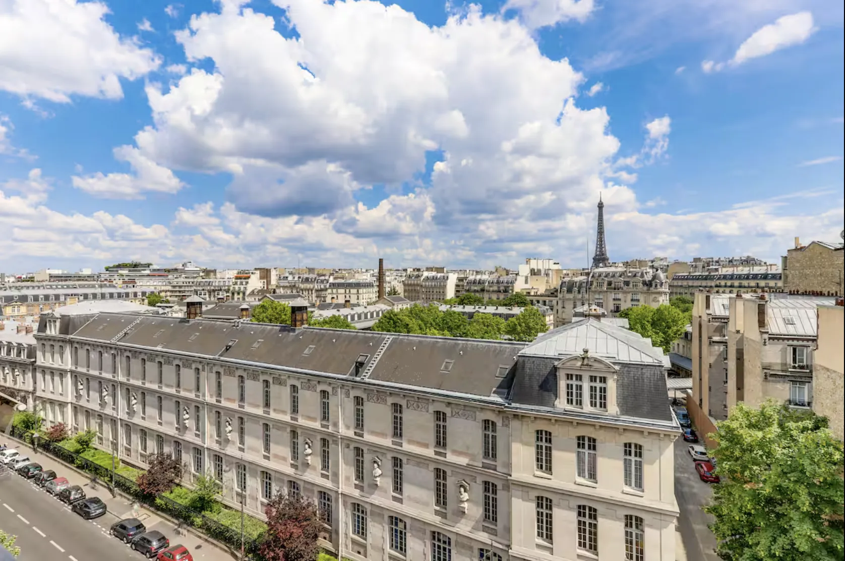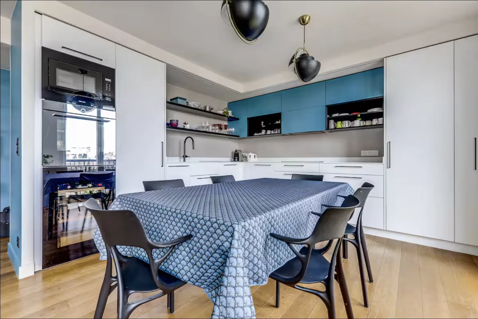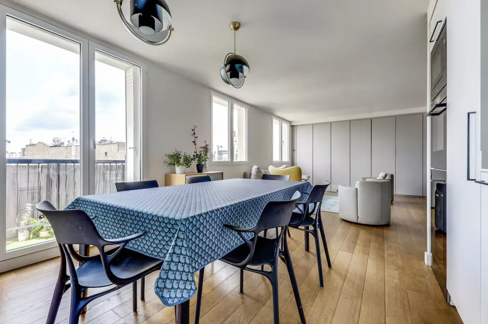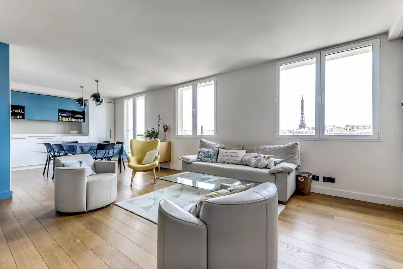 Le vaste salon, à la fois lumineux et accueillant, offre une vue spectaculaire sur Paris et la Tour Eiffel, qui, illuminée la nuit, vous promet des moments inoubliables depuis le confort de votre canapé. La décoration soignée et le mobilier de qualité ajoutent une touche de raffinement à votre séjour.