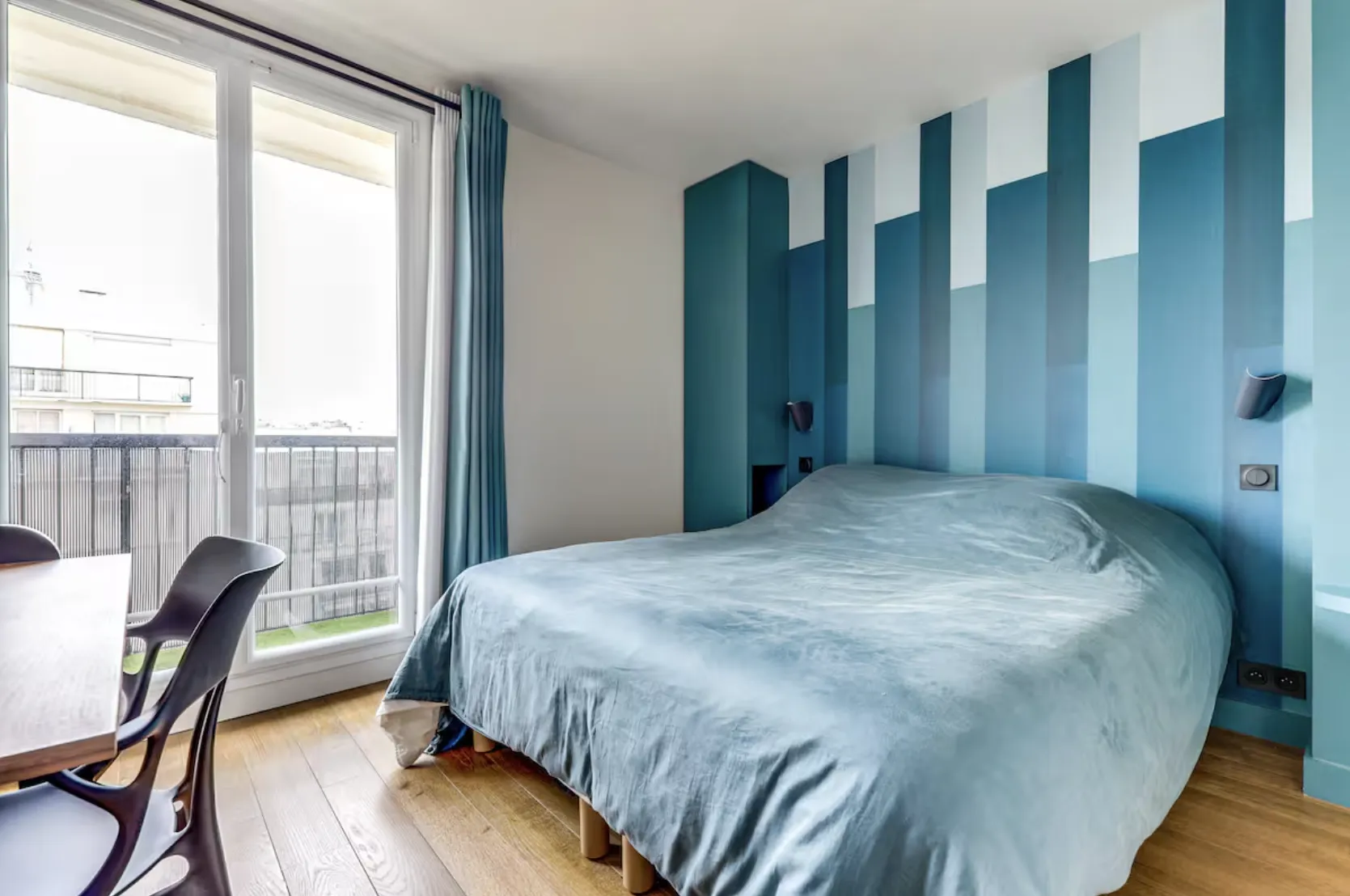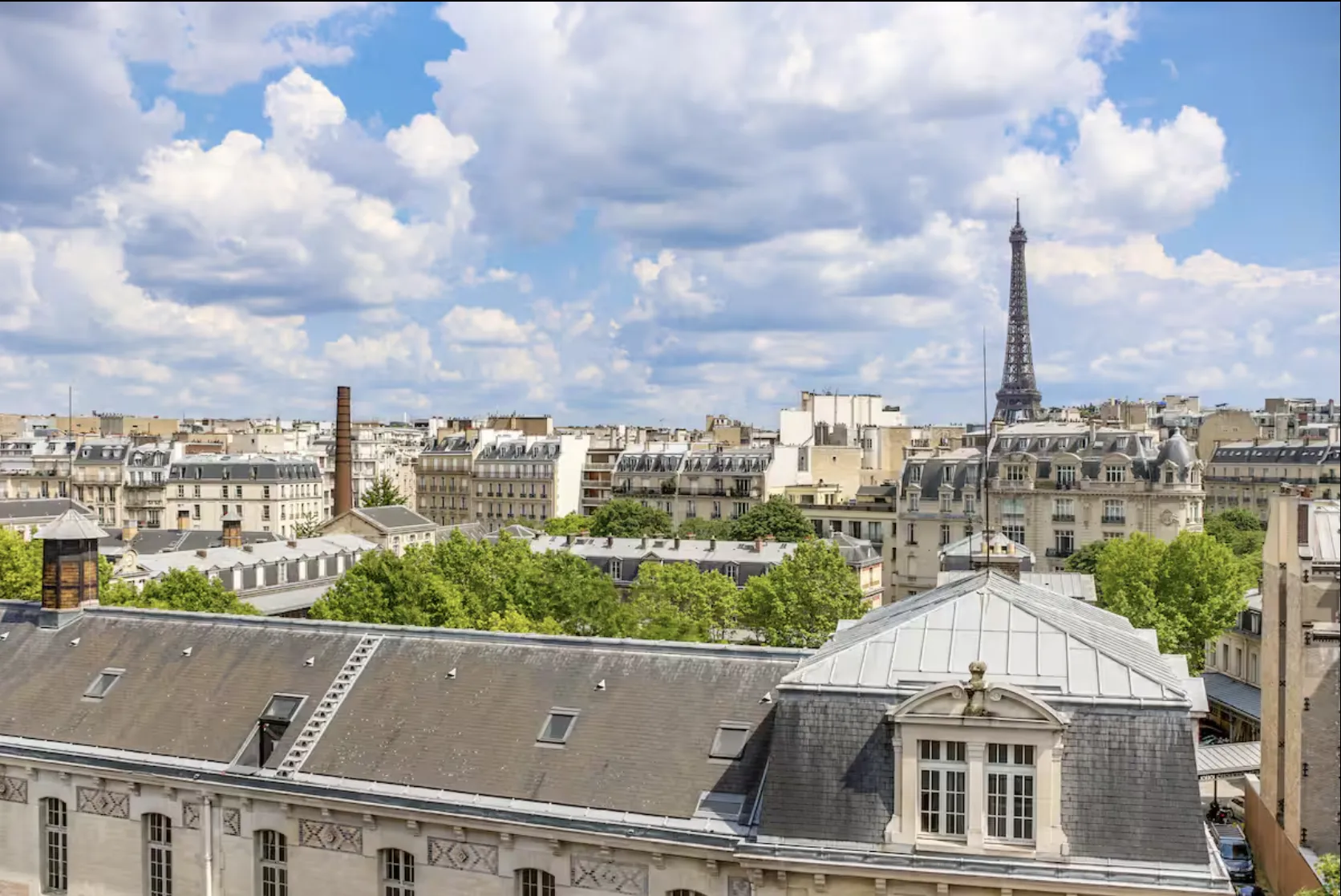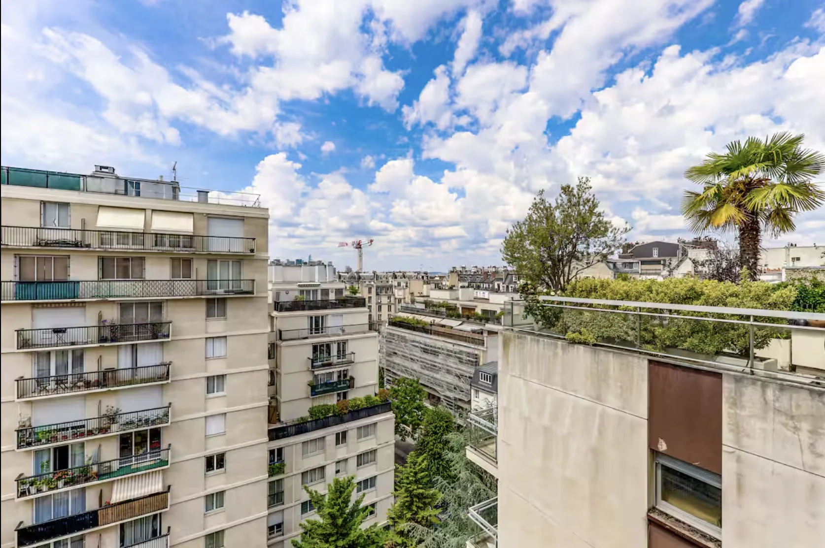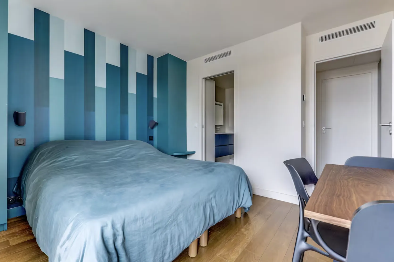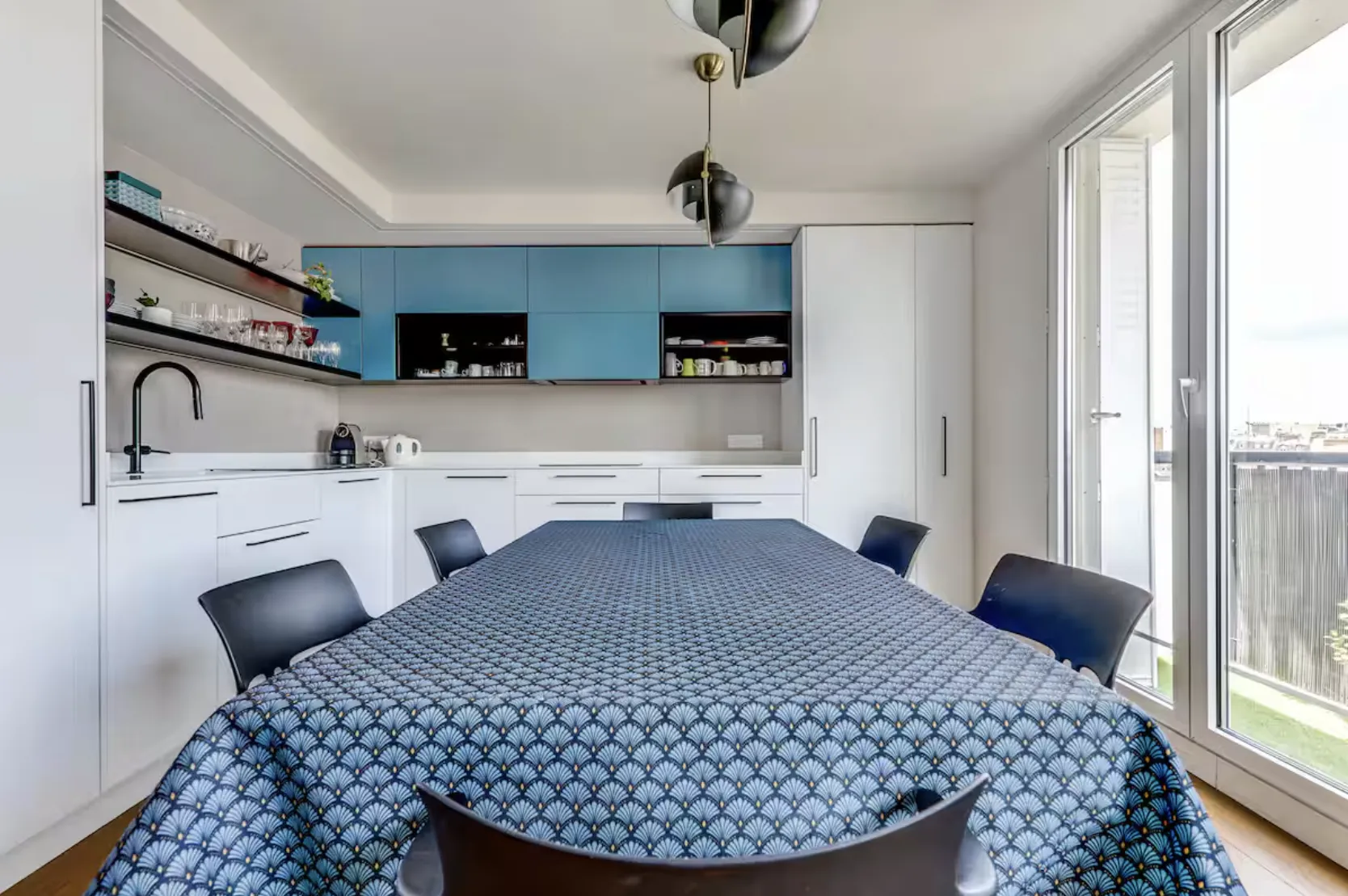 Le vaste salon, à la fois lumineux et accueillant, offre une vue spectaculaire sur Paris et la Tour Eiffel, qui, illuminée la nuit, vous promet des moments inoubliables depuis le confort de votre canapé. La décoration soignée et le mobilier de qualité ajoutent une touche de raffinement à votre séjour.